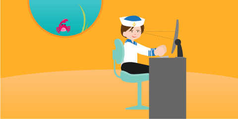 Kijk, hier staat jouw stuurstoel. Ga er maar eens lekker op zitten. Ja, rechtop, hoofd omhoog, rug tegen de leuning, schouders omlaag, voeten op de grond of op een voetensteun. Je handen, polsen en onderarmen houd je in een rechte lijn. Door je stoel te verplaatsen bepaal je de juiste afstand van je lichaam tot het toetsenbord.